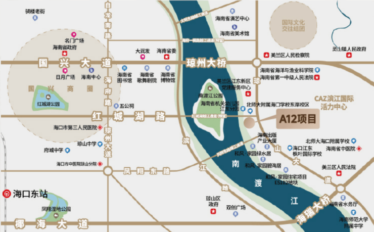 交通 8横8纵主干道路网,5座跨江大桥,快速连通全城,距国兴商圈约5.5公里、距美兰国际机场、海口东站、G98环岛高速约10公里。