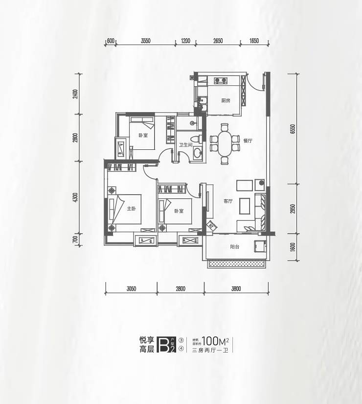 项目坐北朝南,空间舒适,规划4种户型,约99-100㎡三房两厅一卫、约116-119㎡三房两厅两卫
