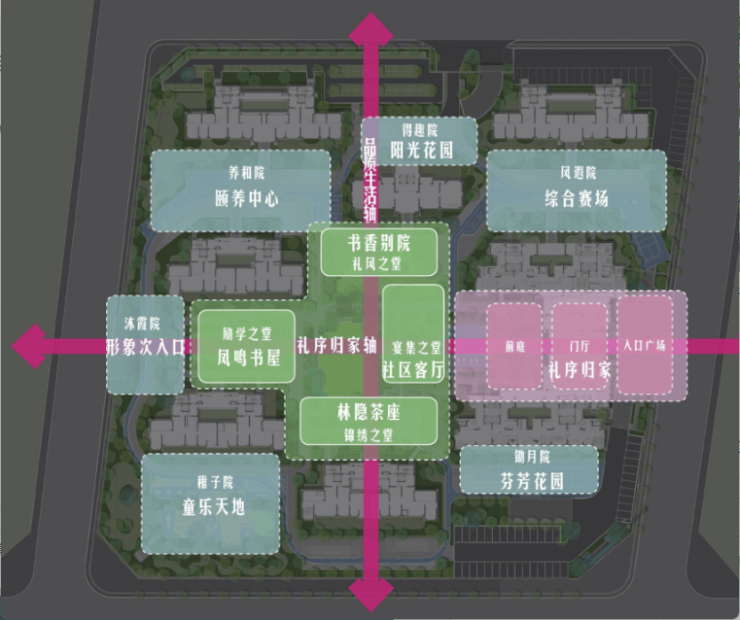 项目传承凤鸣书院的空间格局和文人雅趣,呈“两轴,四堂,六院” 串联整个空间序列,打造多层庭院递进的景观空间结构,形成一处兼具人文内涵与时尚居住的现代社区,营造书香浸润的独特景观体验。