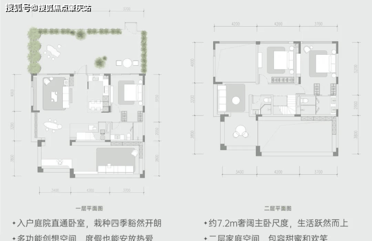 下叠:使用面积约 210㎡,拥有三室四厅三卫一庭院。入户庭院直通卧室,让业主一回家就能感受到大自然的气息,庭院还可栽种花草,打造属于自己的小花园。室内空间布局合理,客餐厨双厅格局,动静结合,既能保证家人之间的亲密互动,又能有各自独立的空间。