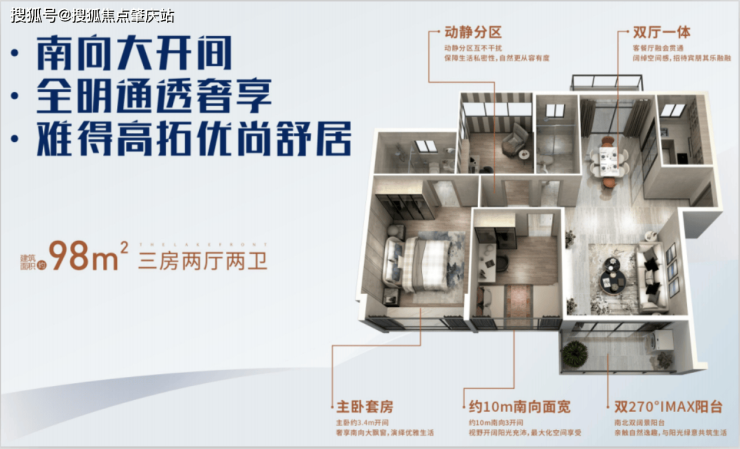 蝶形楼体,270°三面采光通风;全明通透户型,功能分区合理,品质生活从容有度。