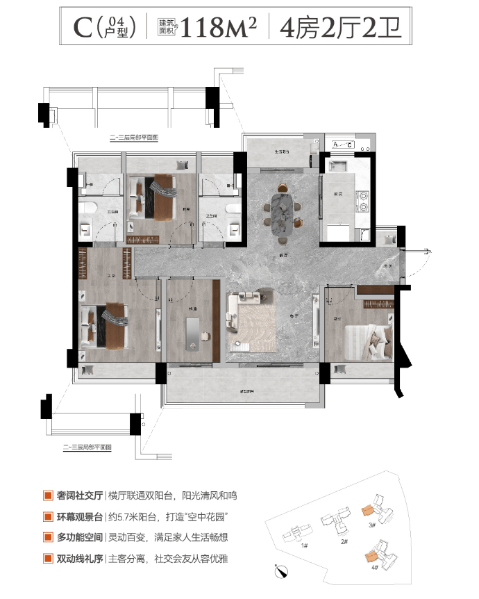户型产品:建筑面积约91-173㎡三至四房