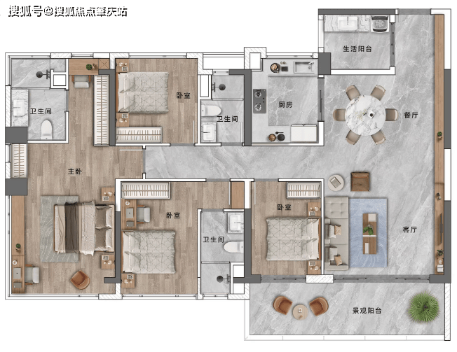 @ 尊崇主套丨套房式主卧布局,270°飘窗观江揽园