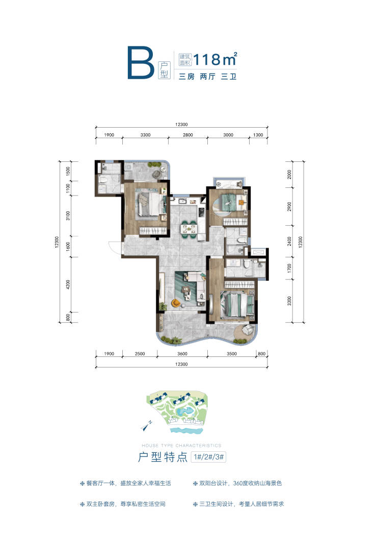 ▼“B”户型图约118㎡三室两厅三卫▼