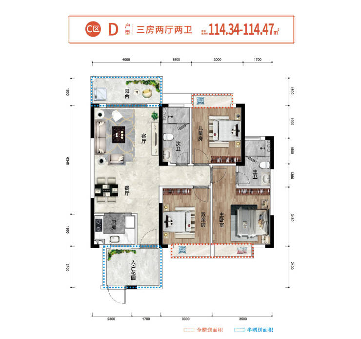 🏖D户型约114.34㎡(三房两厅两卫)