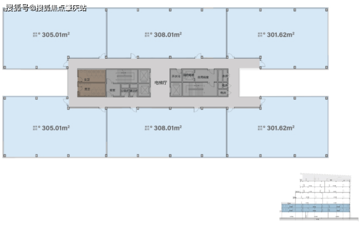 3# 楼:约 301-322㎡商务空间,首层 6 米层高,2-4 层 3.6 米层高,5-9 层 5.4 米层高。