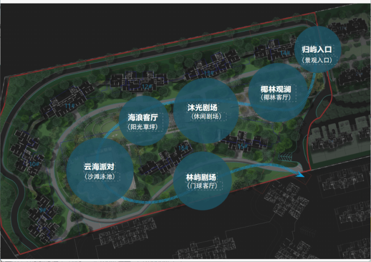 以“林屿” 为主线贯穿园林始终,结合度假生活的需求和海岛的居住文化、自然资源景观等,园林八大主题空间串联,包括椰林嘉观澜,沐光剧场、海浪客厅等场景交织,兼顾功能性和美观性,为湾区园林生活树立一个新标准。