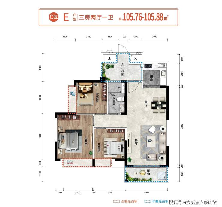 🏖E户型约105.76㎡(三房两厅一卫)