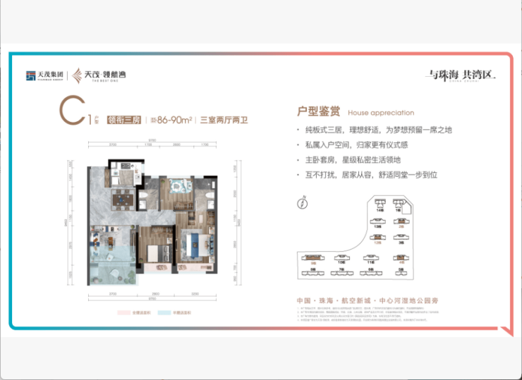 东临海岸线,尽享金湾情侣路的浪漫惬意;紧邻金湾中心河湿地公园,拥天然绿肺;府揽航空新城繁荣景象;坐享海、河、湿地、城四重景观。西部生态新城理想人居,享受高氧生态环境。