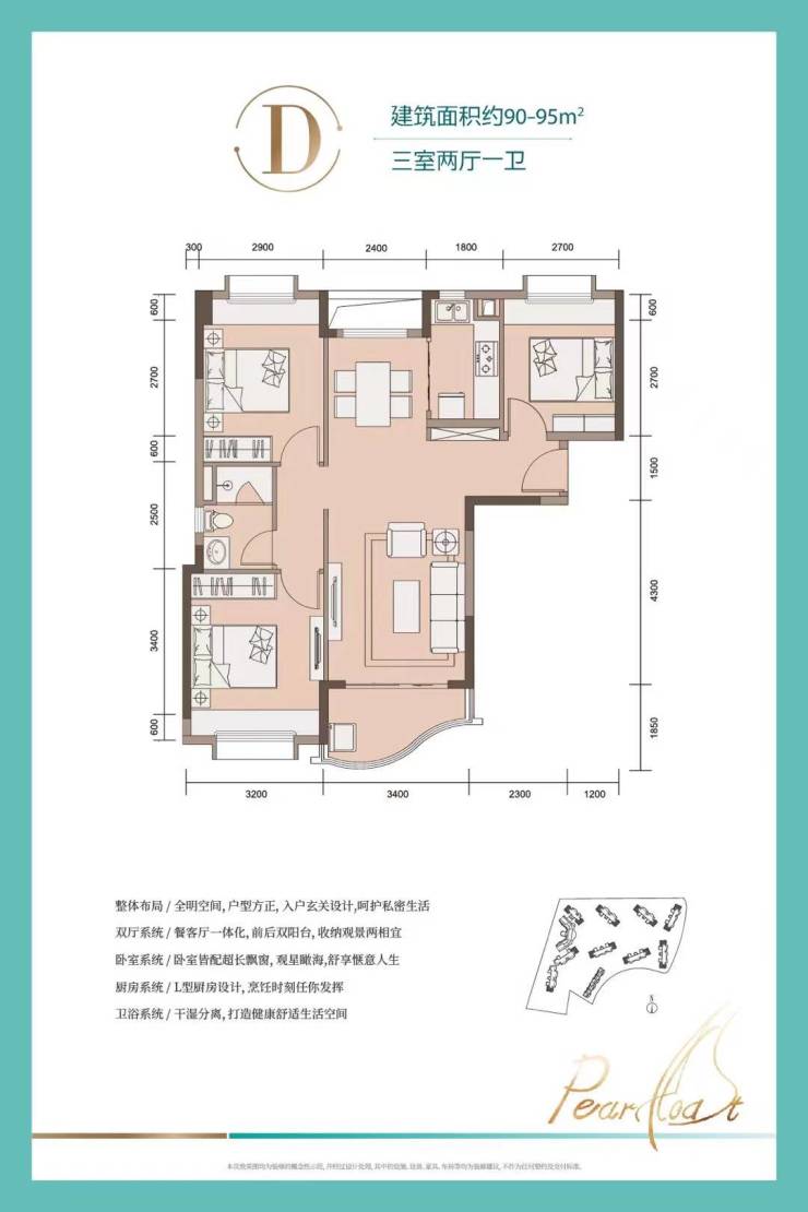 D户型-建筑面积约90-95㎡ 三室两厅一卫:餐客厅一体化,收纳观景两相宜