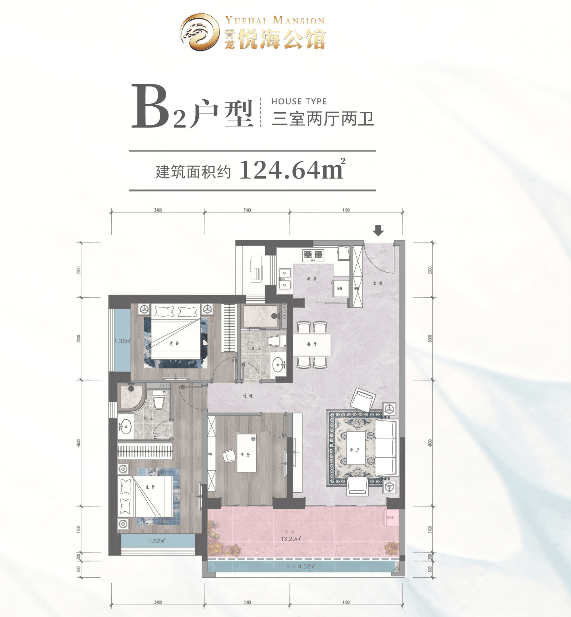 B2户型 建面约124.64㎡,三房两厅两卫