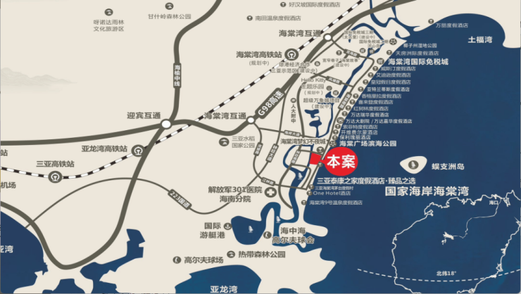 2 个动车站:本案距离亚龙湾站约16km,距离海棠湾站(规划)约12km;