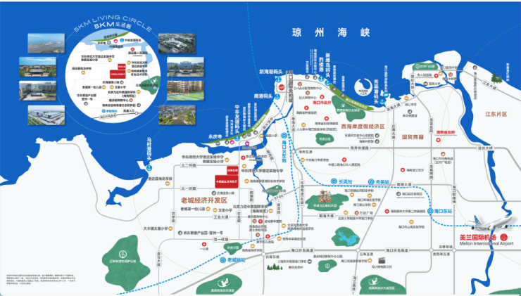 高铁+高速立体交通:项目距老城镇高铁站3.3km,15分钟直达海口东站;到全球最大单体免税店--cdf海口国际免税城约18分钟车程、到海南出入岛的重要港口新海港约20分钟车程、到海口美兰国际机场约25分钟车程;金马大道快速化改造完成,避开拥堵,通勤效率提升40%;马村港货运枢纽5公里,生鲜物流极速达,生活物资更新鲜。