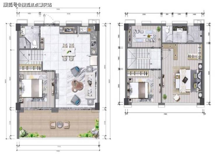 1F客厅及厨房、1F客卧、1F超大阳台