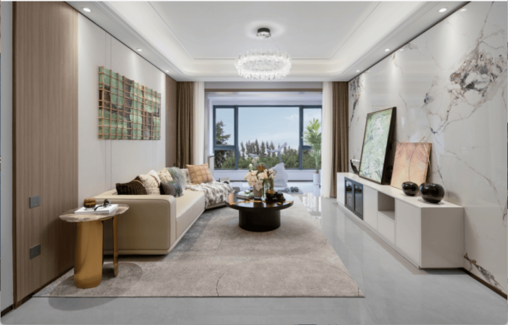 颜值墙面:电视背景墙采用整面大理石岩板铺贴,沙发背景墙采用木饰面+布艺硬包,主卧背景墙布艺硬包