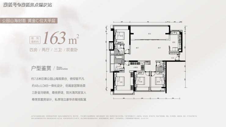 ③163㎡户型处于正品字型黄金单边位独享无遮挡的一线巨幕无界山海公园景观。
