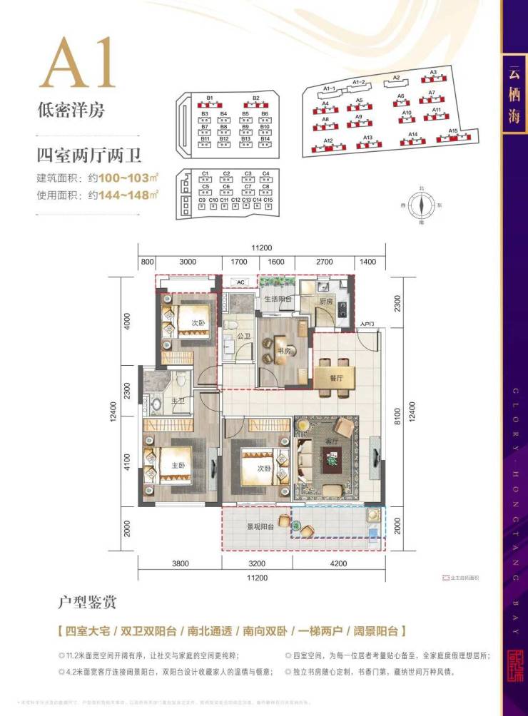 1、A1 100平米四房两卫,使用面积140-148平米