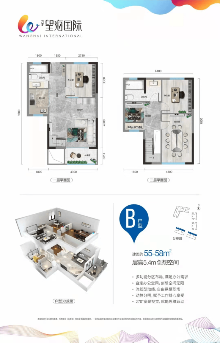 一期户型:建面 55-73㎡,层高 5.4 米
