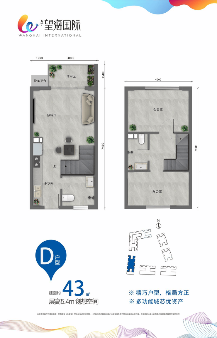 二期户型:建面 43㎡,层高 5.4 米