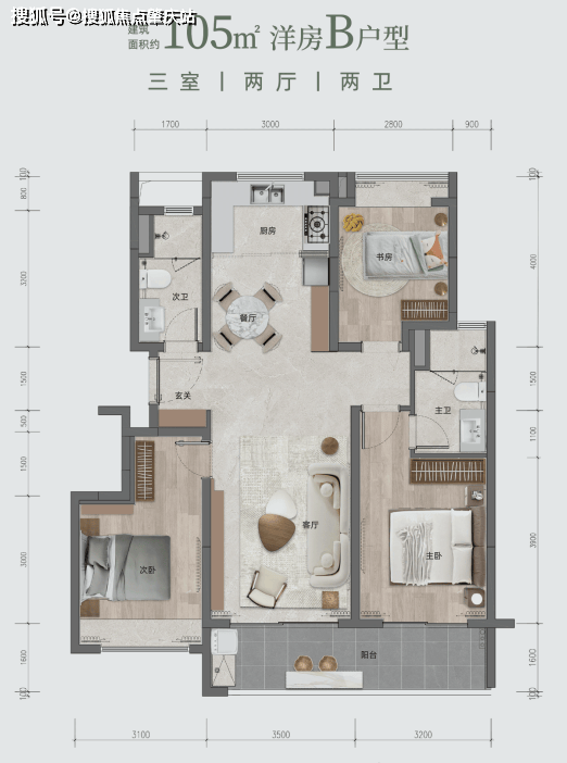 洋房 B 户型:面积约 105㎡或 105.8㎡,三室两厅两卫。三开间朝南,南北通透,主卧联通约 6.7 米南向阳台,双厅竖向 LDKB 一体格局。