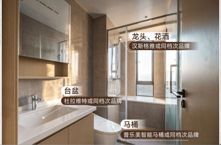 坚持“高端精品”产品信条,采用全屋智能马桶、凉霸、暖风机、杜拉维特(或同档次品牌) 卫浴台盆、汉斯格雅(或同档次品牌)淋浴花洒等知名品牌交标,全屋精装交付标准拔升人居新高度,筑就城市人居名片。