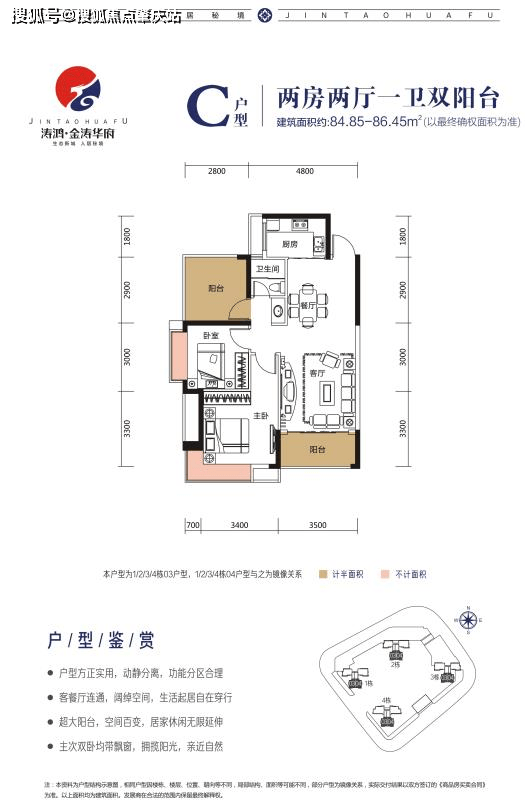 ?建面约84.85-86.45㎡两房两厅一卫双阳台